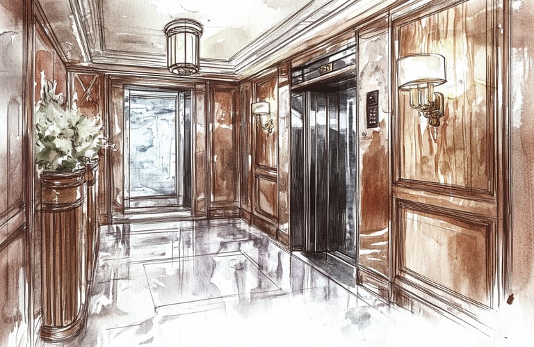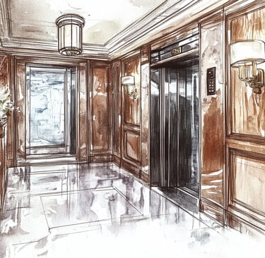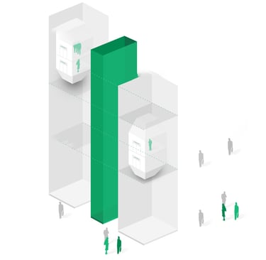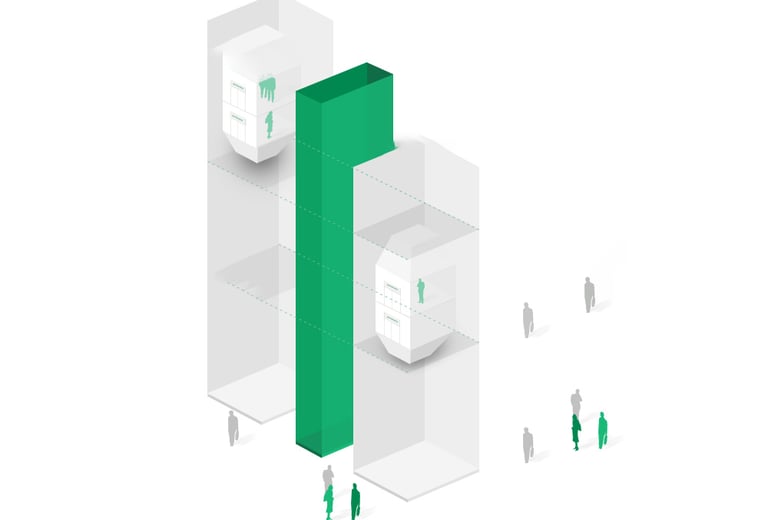 The double-deck elevator is a high-capacity system with two vertically connected cars in one hoistway, maximizing space efficiency, increasing rental revenue, and reducing construction costs.