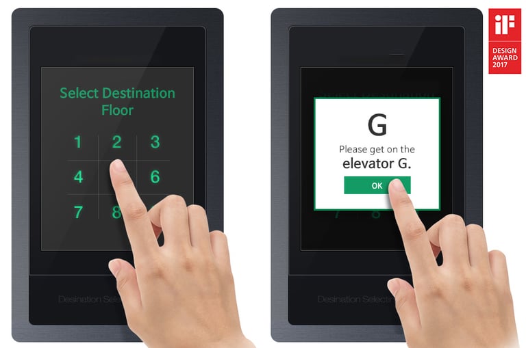 The passenger selects a destination floor, and the system analyzes the number of passengers, as well as their departure and destination points, to assign the most optimal elevator.