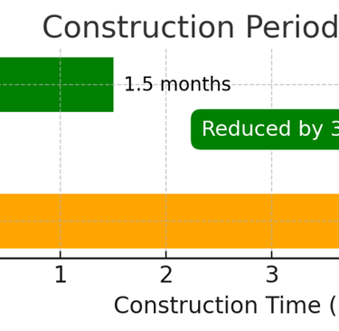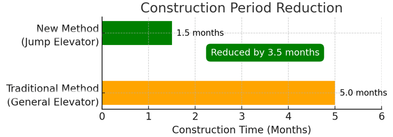 Shortened by up to 3.5 months compared to conventional methods. Finishing work expedited due to more efficient exterior installation (e.g., curtain wall system).