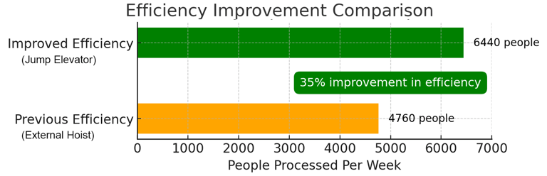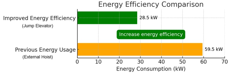 Increased by 35% compared to an external hoist. Operable year-round, unaffected by weather conditions. Enables 24-hour operation, including night work, with no noise concerns.