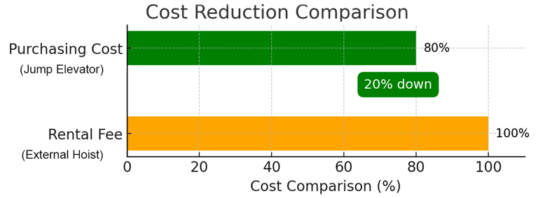 Reduced by 20% compared to using an external hoist. Savings in rental fees, labor costs, and incidental expenses.